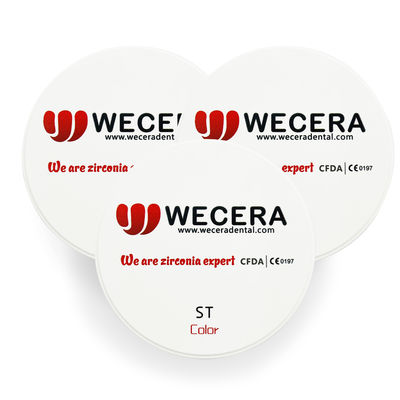 Le disque de zircone de couleur de St de Wecera est fait en poudre nanoe biologique 100% de zircone à partir de Tosoh avec la technologie de production pressante isostatique froide, il convient derrière faire face de fabrication, au cadre, à la sous-structure, à la couronne postérieure et au pont. C'est zircone Pré-ombragée translucide superbe.