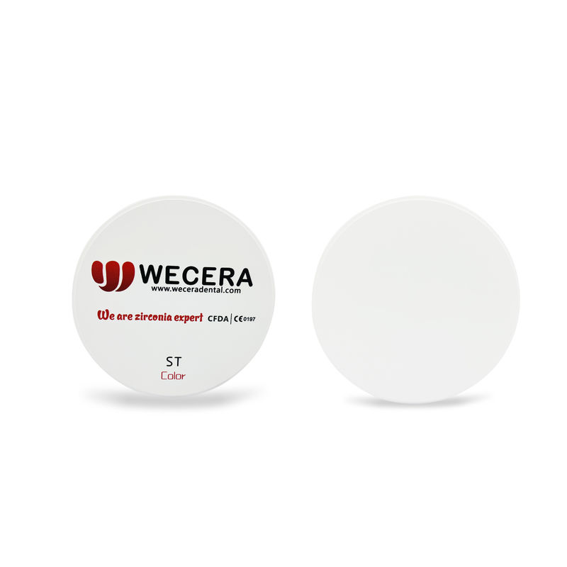 Le disque de zircone de couleur de St de Wecera est fait en poudre nanoe biologique 100% de zircone à partir de Tosoh avec la technologie de production pressante isostatique froide, il convient derrière faire face de fabrication, au cadre, à la sous-structure, à la couronne postérieure et au pont. C'est zircone Pré-ombragée translucide superbe.