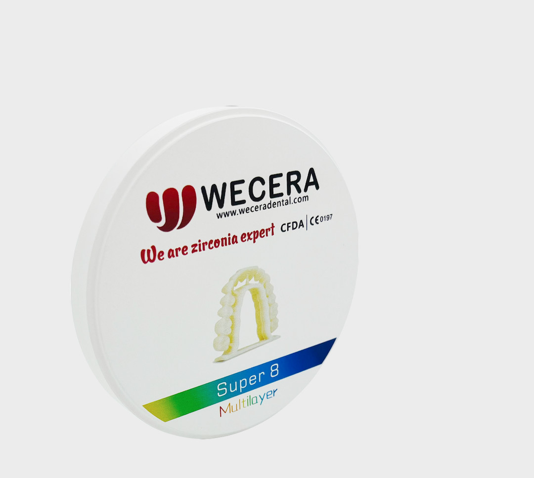 8 couches de zirconium multicouches, avec plus de couches, l'apparence est transparente.Ce matériau en zirconium permet de créer un pont de 14 unités sans aucune déformation après le processus de frittage.