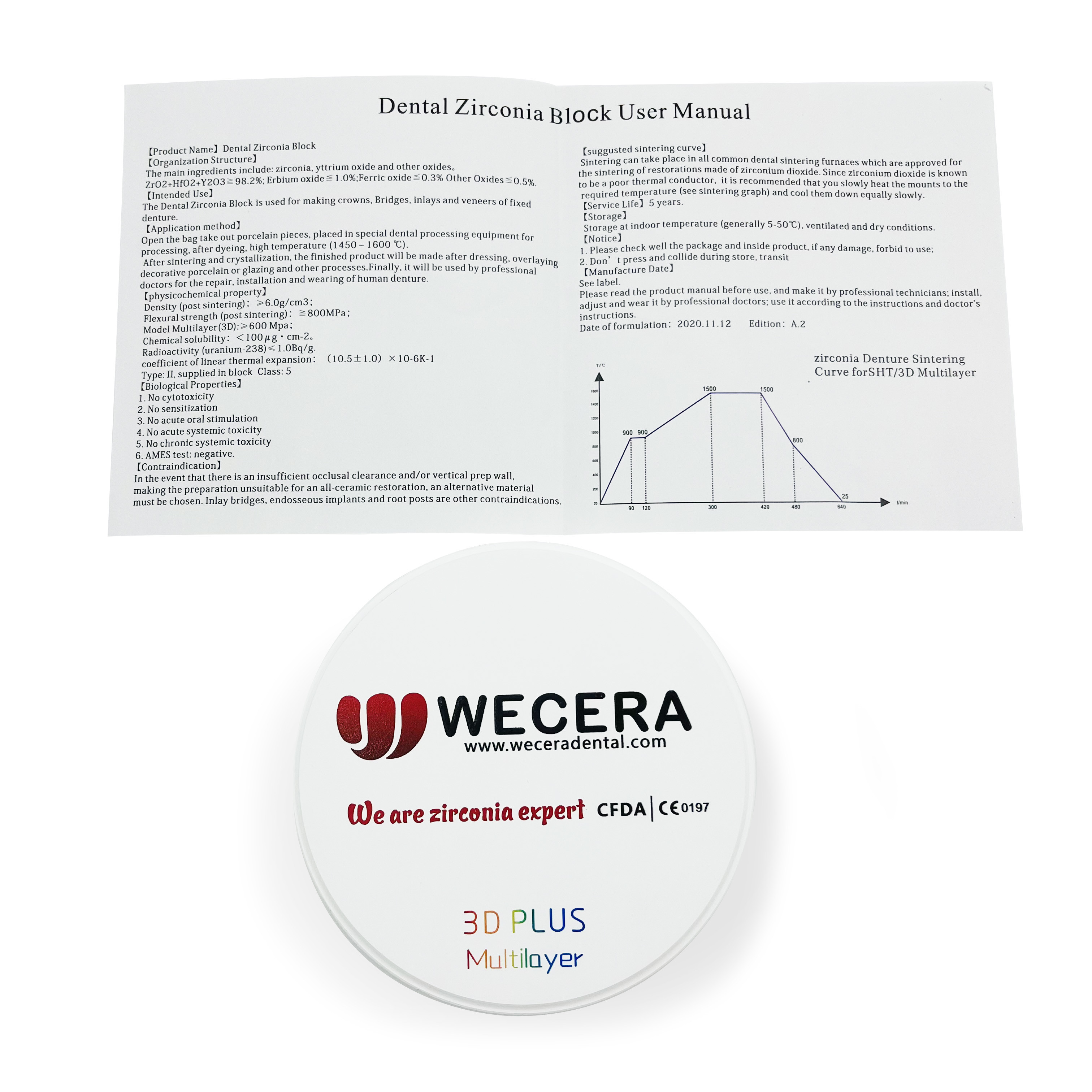 Que vous soyez un laboratoire dentaire cherchant à rationaliser votre processus de production ou un clinicien à la recherche de restaurations de haute qualité pour vos patients,le WECERA 3D Plus Multilayer Zirconia est le choix parfaitSa combinaison de technologie avancée, d'esthétique supérieure et de performances fiables en font un produit incontournable pour tout professionnel dentaire.